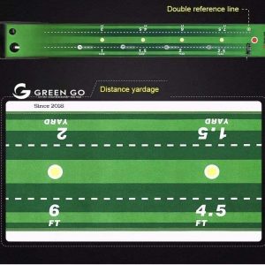 + Phần green: các vạch kẻ trắng đứt đoạn nối thắng tới lỗ golf giúp cho việc định vị hướng bóng đi dễ dàng hơn, ngoài ra có các vạch căn khoảng cách – giúp cho việc tập căn lực putt hiệu quả hơn